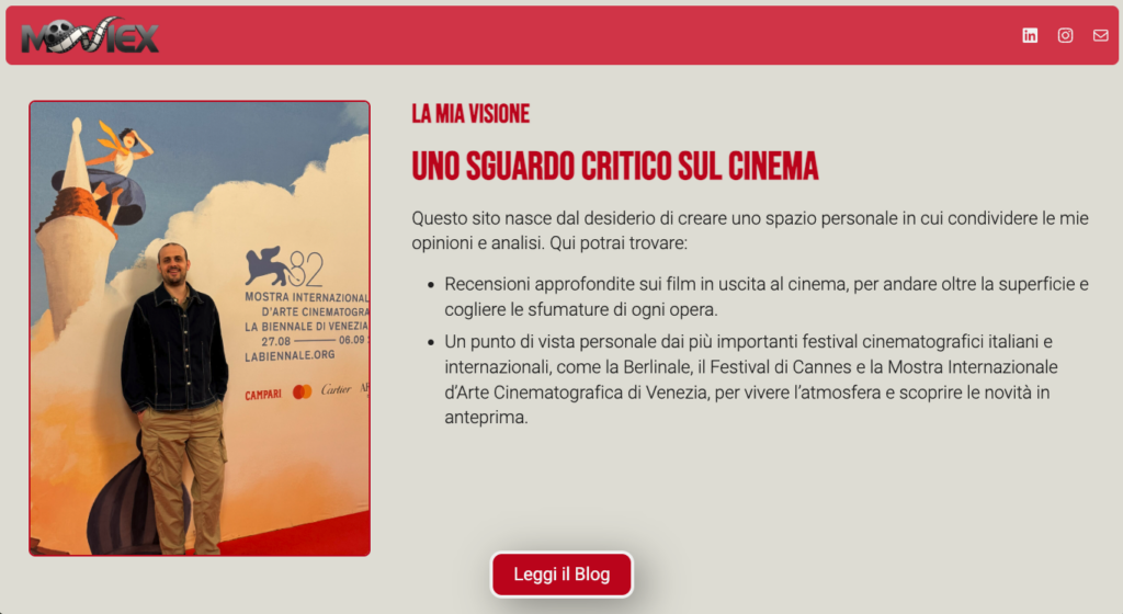 Per Andrea Dall’Armi, critico e appassionato di cinema, abbiamo realizzato Moviex.it, un blog professionale dedicato all’analisi e alle recensioni cinematografiche. L’obiettivo del progetto è stato quello di creare uno spazio digitale autorevole e personale, dove la passione per il grande schermo potesse tradursi in una narrazione chiara e strutturata.