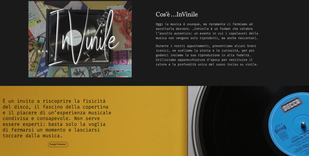 Per InVinile, un progetto dedicato alla riscoperta dell’ascolto musicale su vinile, abbiamo realizzato un sito web d’impatto che punta tutto sull’estetica e sul coinvolgimento visivo.
