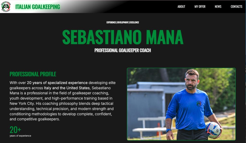 Per Italiangoalkeeping abbiamo progettato e realizzato un sito web completo, pensato per trasmettere professionalitร , passione e competenza. Dopo anni di esperienza come allenatore in grandi societร , il nostro cliente Sebastiano Mana ha deciso di lanciare un nuovo progetto con lโ€™obiettivo di far emergere giovani portieri negli USA.
